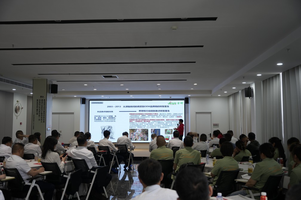 參觀結束后,眾人齊聚會議室,參加由金曄食品創始人李金倫主講的學習交流會。在分享中,李總以“回歸原點創造美好”為主題,結合金曄的成長故事,深入闡釋了企業如何將稻盛經營學融入日常經營,如何把“敬天愛人”的理念落地生根,深入淺出地分析了當前食品行業的發展趨勢和挑戰,并分享了企業如何在市場競爭中堅守初心、不斷創新的重要性。他講到,回歸原點就是回歸簡單純粹和真誠善良,人生和經營的成功無非是回歸原點的行動。他強調,企業需將哲學思維(如稻盛和夫理念)與實戰管理(如華為流程優化)融合,形成獨特的經營體系。他還提出用戶導向,通過“空椅子”機制讓用戶虛擬參與決策,分歧時優先遵循用戶立場;首創無添加山楂制品,以包裝革新(自立袋、拉鏈設計)提升體驗;拆分職能部門為“傳統+現場”雙線,推行阿米巴模式激發團隊自主性。李總對企業使命的解讀、對員工關懷的重視、對讀書學習的熱愛和感受,以其豐富的經驗和獨到的見解,讓與會者深受啟發,進一步認識到企業文化與價值觀在企業發展中的核心作用。