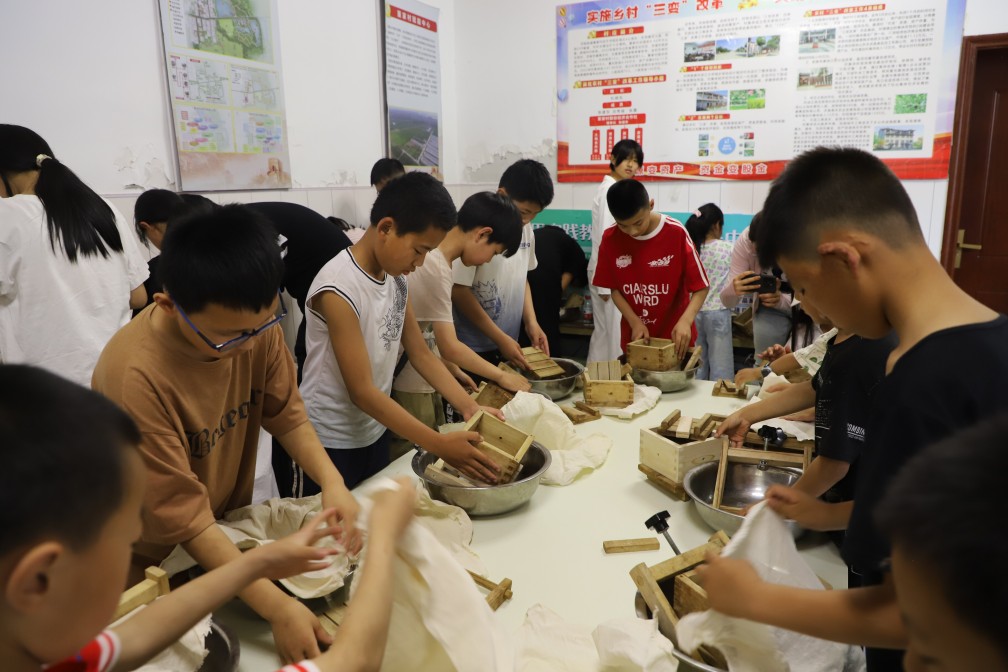 在豆工坊追溯百年匠心傳承,體驗非遺石磨工藝。孩子們推動磨把,乳白的豆漿緩緩滲出,空氣中漸漸彌漫出清新的豆香。孩子們小心翼翼地將豆花倒入模具,輕輕壓實。等待脫模時,每個孩子都充滿期待。當孩子們打開模具,看著自己親手制作的豆腐,臉上洋溢著自豪的笑容。